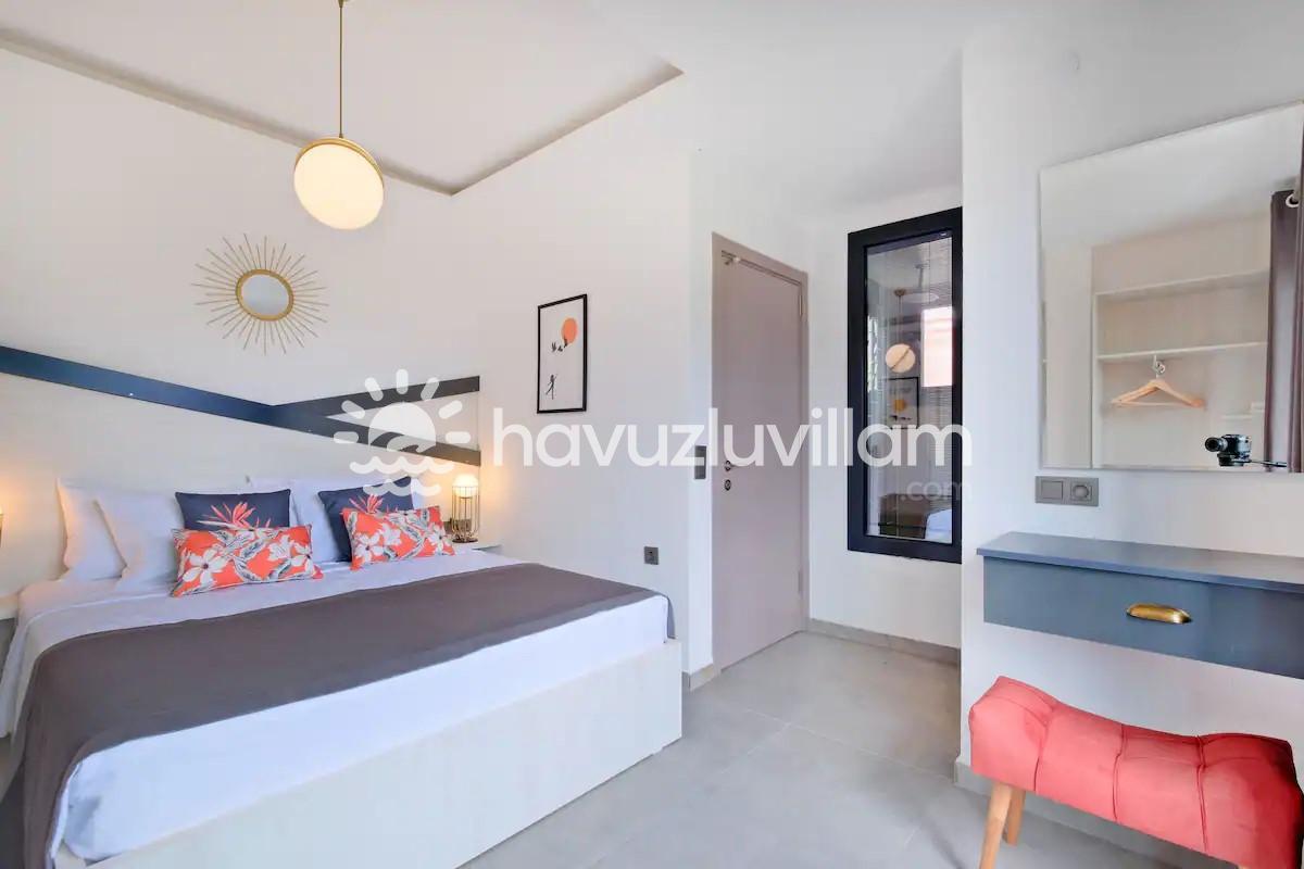 Villa Aydın Trio 1, 6 kişiye kadar konaklama imkanı sunan 3 yatak odası ve 3 banyo-tuvaleti ile geniş aileler veya arkadaş grupları için biçilmiş kaftandır. 36 m2 büyüklüğündeki özel havuzun tadını çıkarırken güneşin altında keyifli saatler geçirebilir, villanın geniş alanlarında akşam yemeklerinizde eğlenceye devam edebilirsiniz. Kendinizi evinizde hissedeceğiniz bu özel mekan, 3 çekirdek aile için konforlu ve huzurlu bir tatil geçirmeniz için özel olarak tasarlandı.
