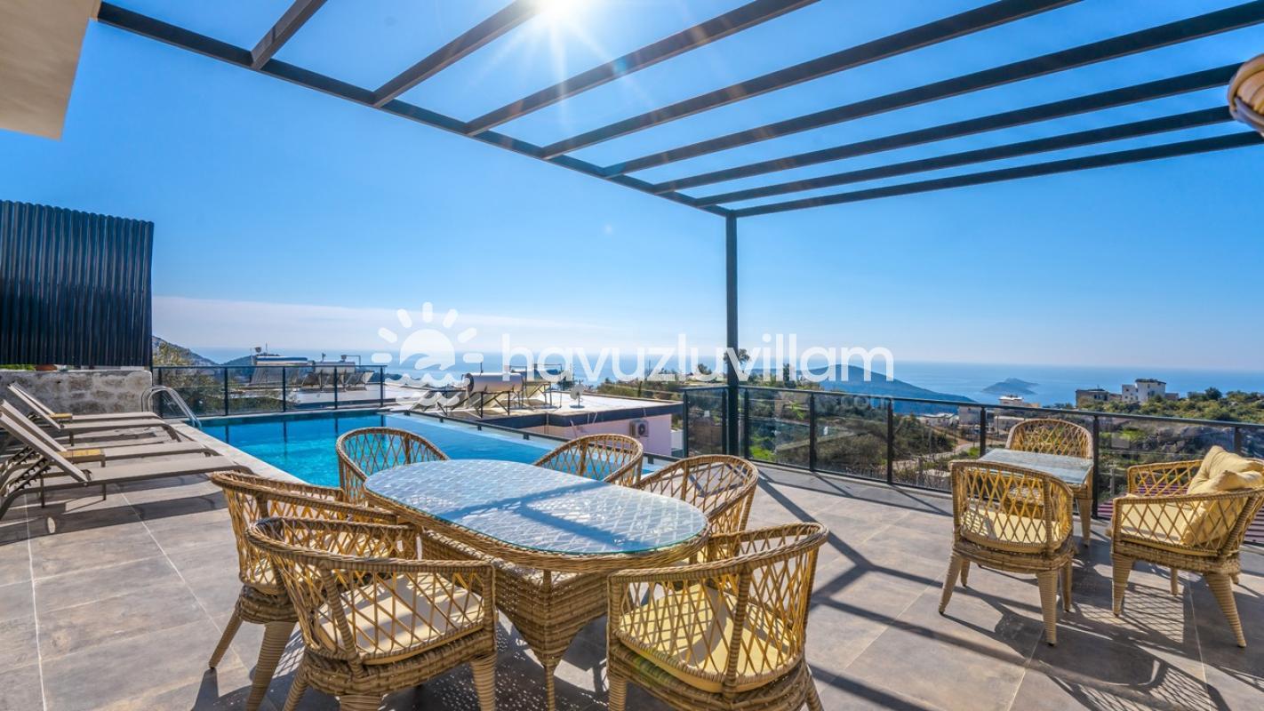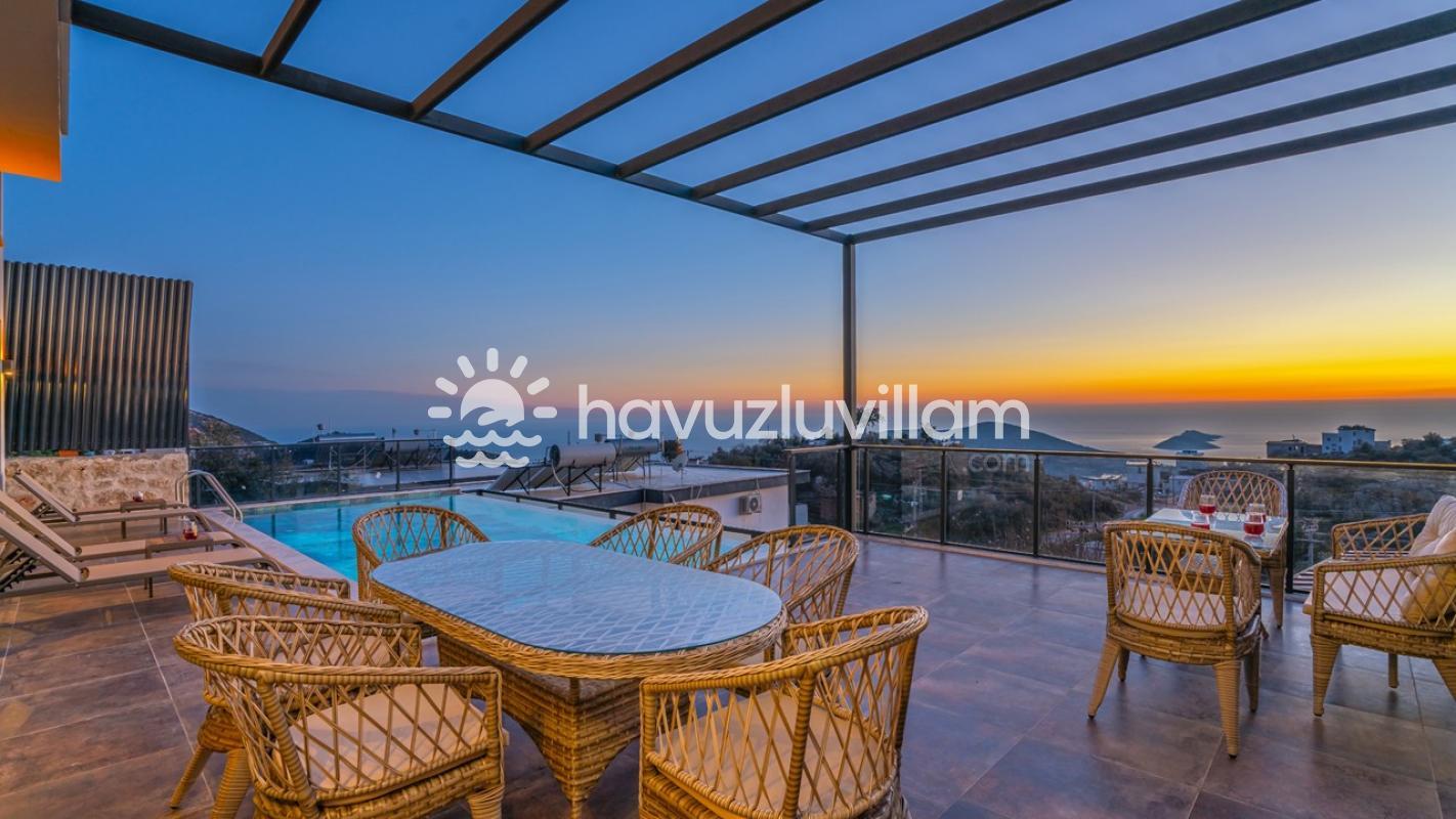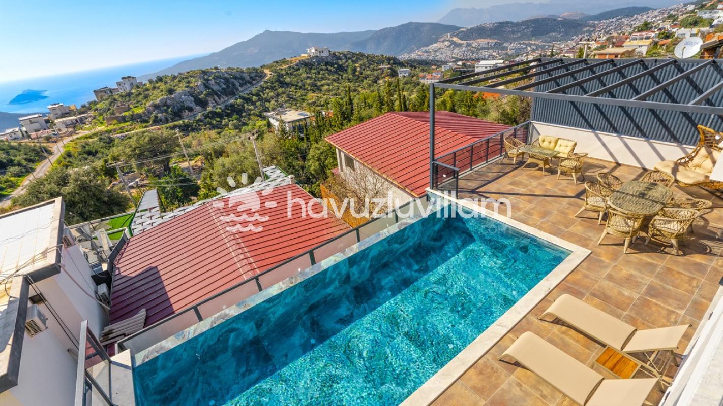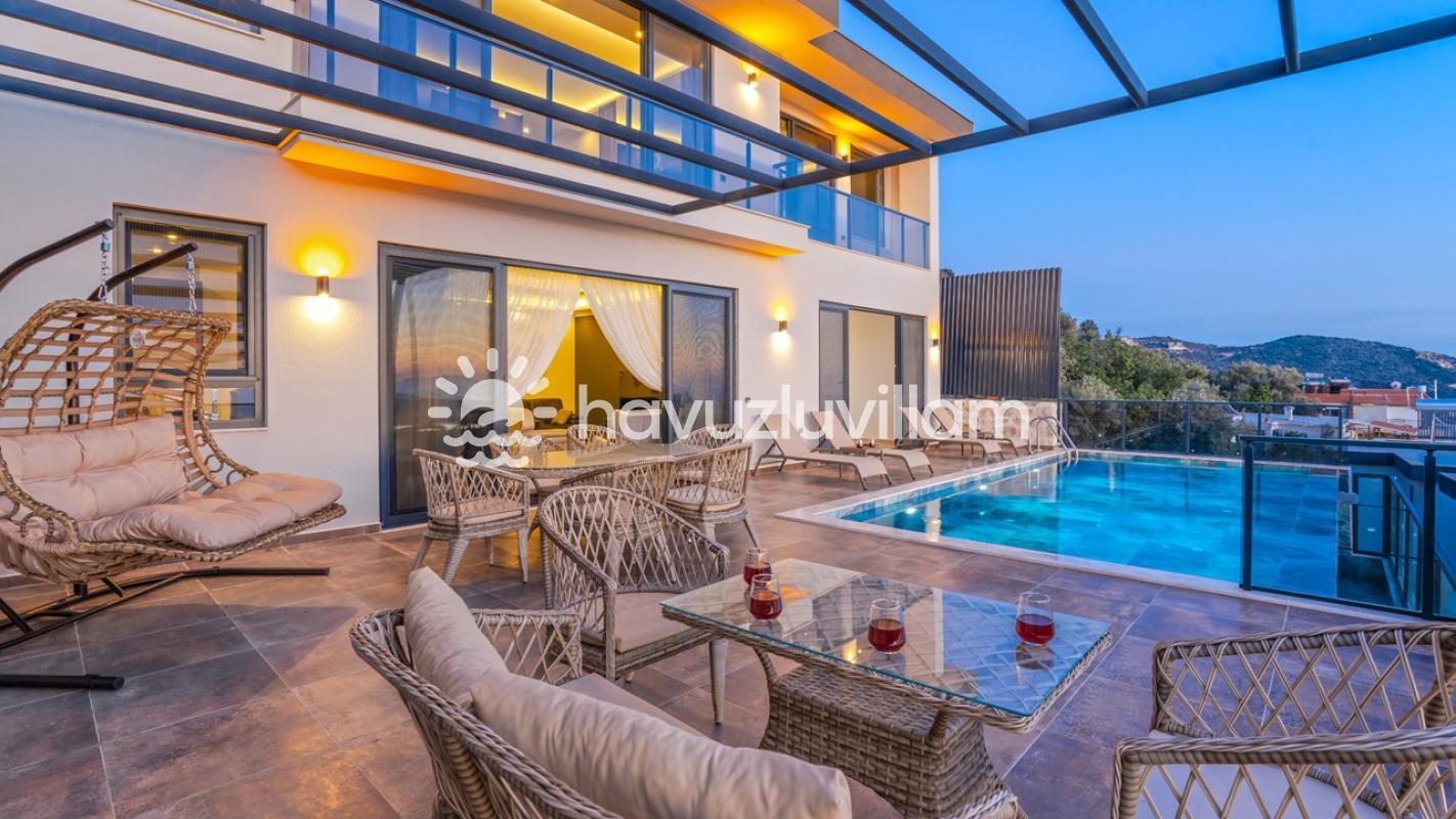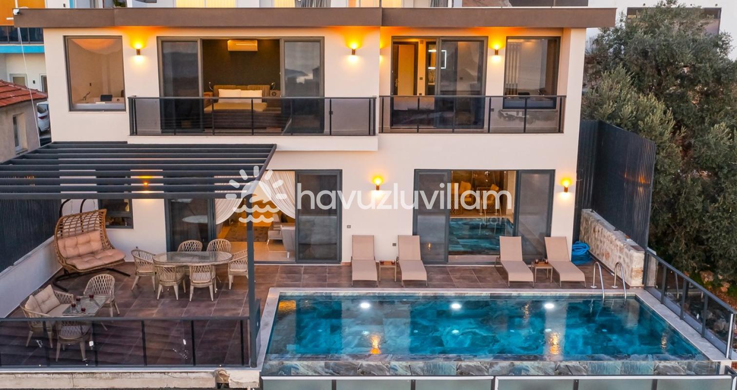 Kalkan'ın eşsiz manzarasını her katından sunan Villa Azra, 3 yatak odası, 2 salonu ve 6 kişilik konaklama kapasitesiyle mükemmel bir tatil kaçamağı sunuyor. Deniz manzaralı geniş havuz terası, Kalkan'ın büyüleyici manzarasını izlerken rahatlatıcı bir ortam sağlar. Villamız, modern jakuzi, hamam ve sauna gibi lüks özelliklerle donatılmıştır, böylece konuklarımız kendi özel spa deneyimlerini yaşayabilirler.