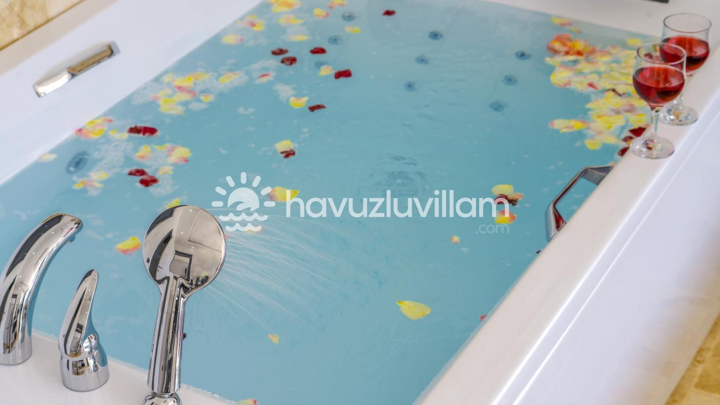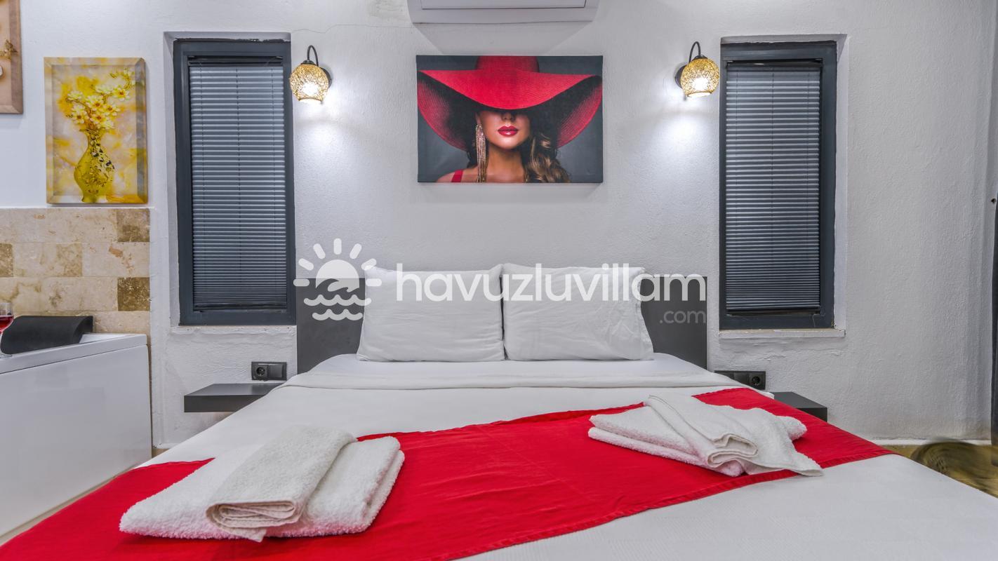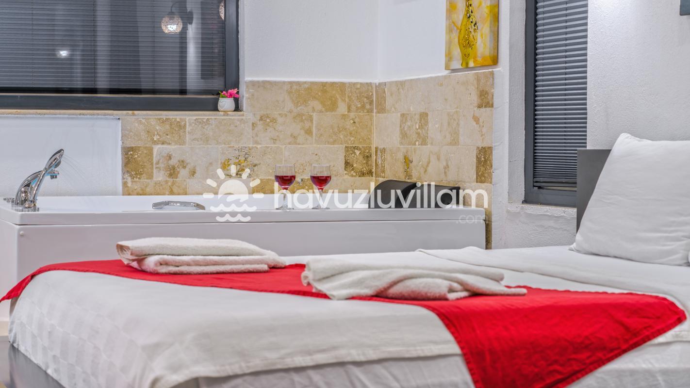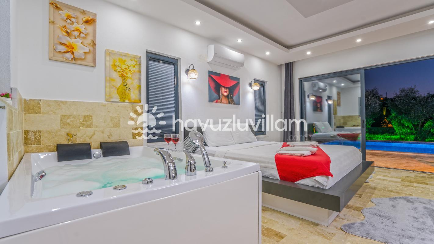 Villa Sakura'nın ebeveyn odasında bulunan çift kişilik jakuzisi, şık ve zevkle döşenmiş mobilyalarıyla lüks bir tatil deneyimi sunar. Konforlu alanları ve doğanın sakinliğiyle çevrili atmosferiyle Villa Sakura, size huzur dolu bir kaçamak yaşatmak için bekliyor.