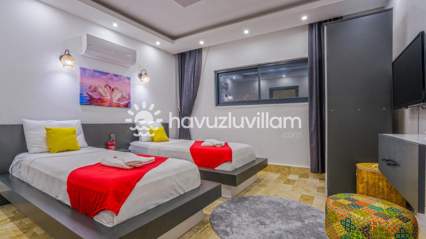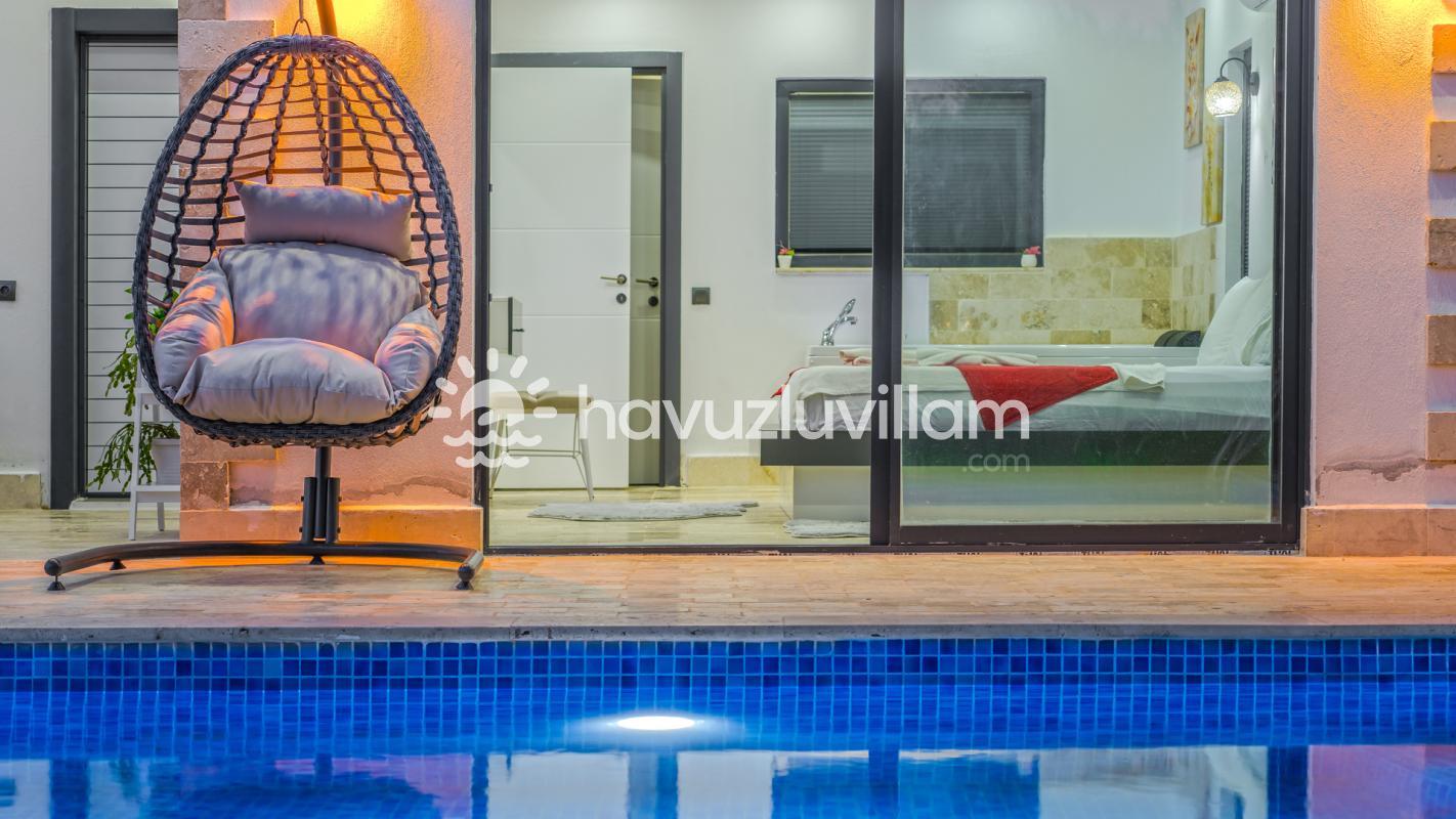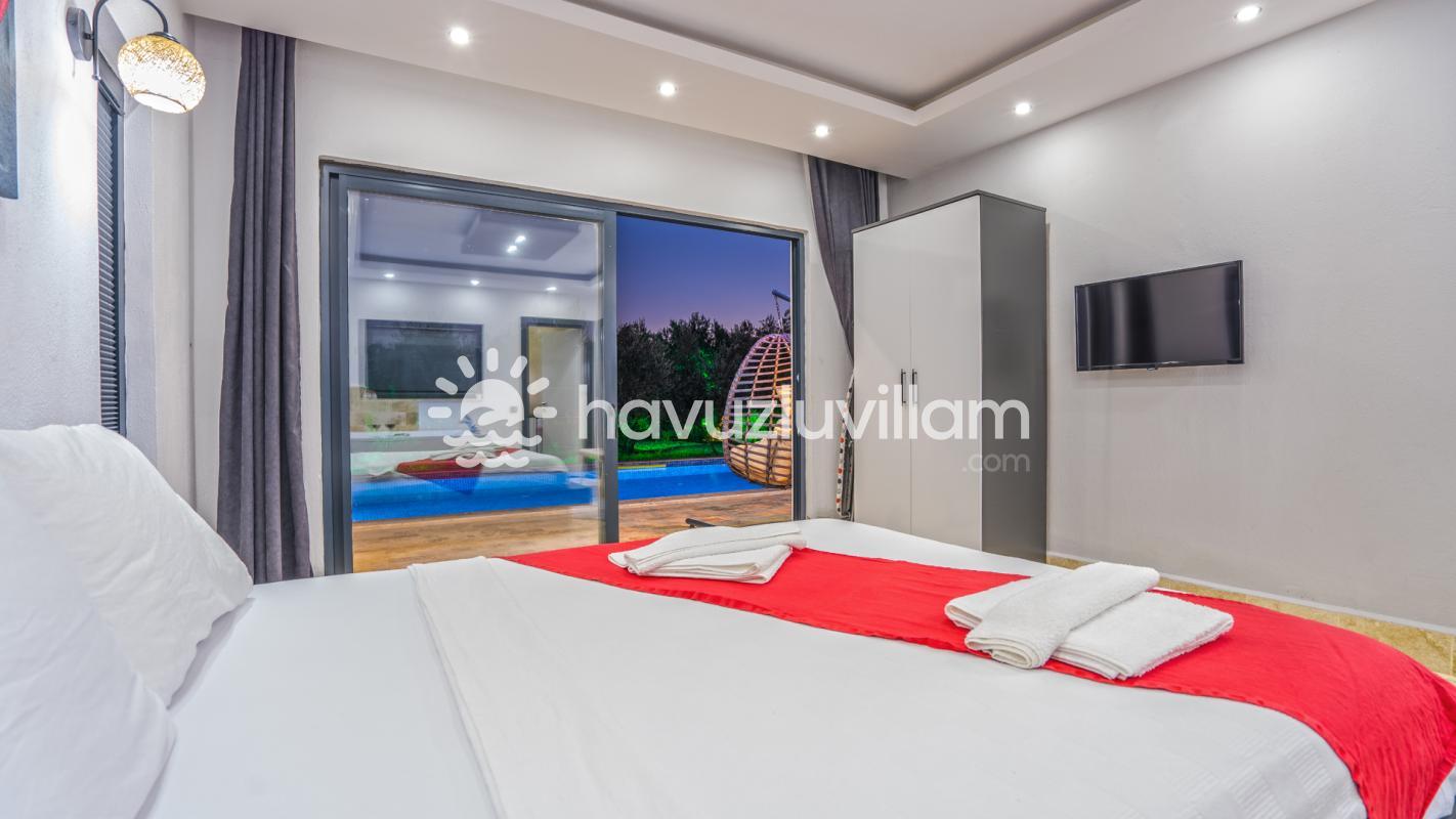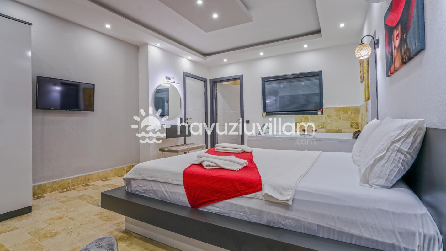 Villa Sakura'nın ebeveyn odasında bulunan çift kişilik jakuzisi, şık ve zevkle döşenmiş mobilyalarıyla lüks bir tatil deneyimi sunar. Konforlu alanları ve doğanın sakinliğiyle çevrili atmosferiyle Villa Sakura, size huzur dolu bir kaçamak yaşatmak için bekliyor.