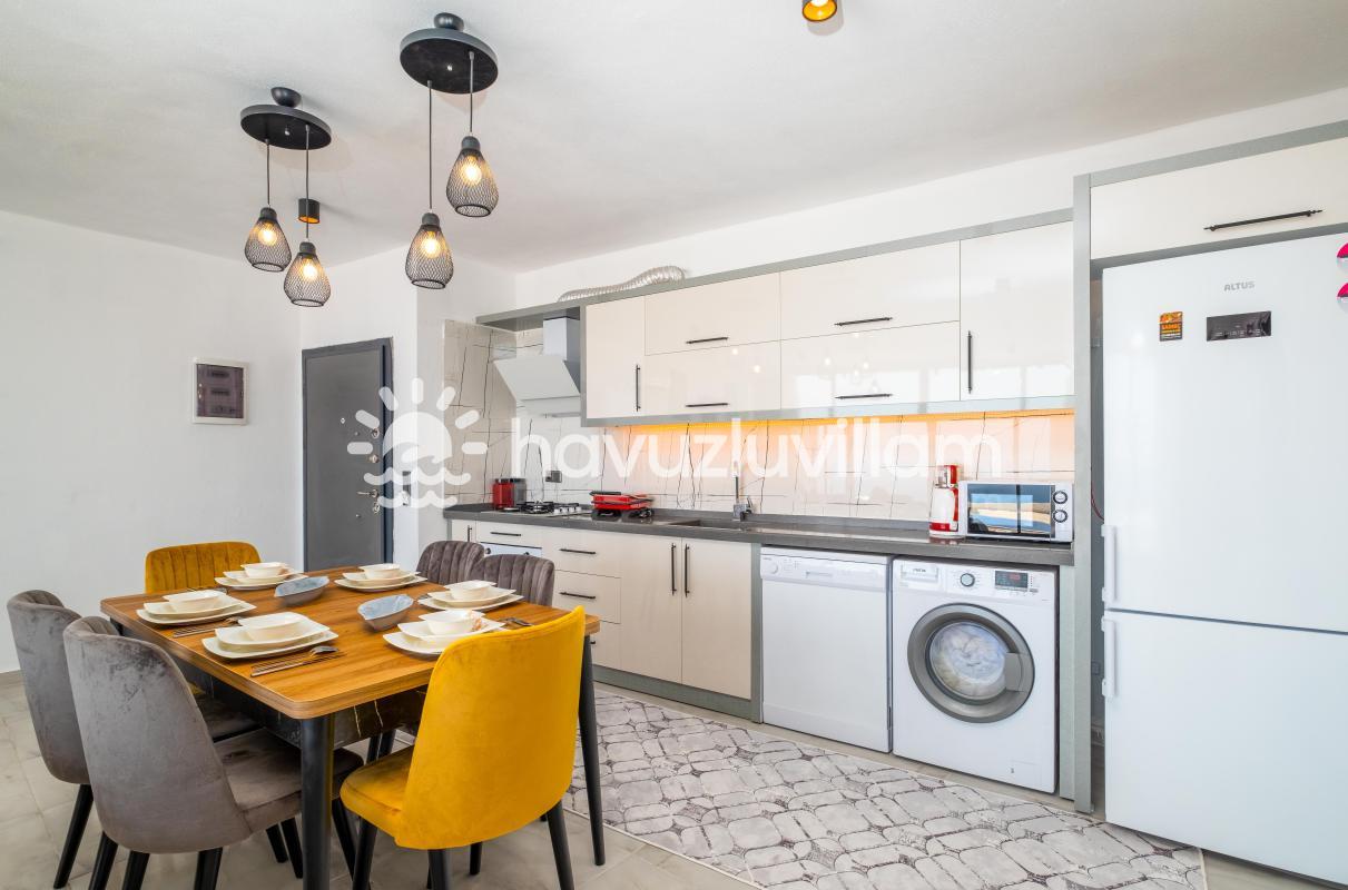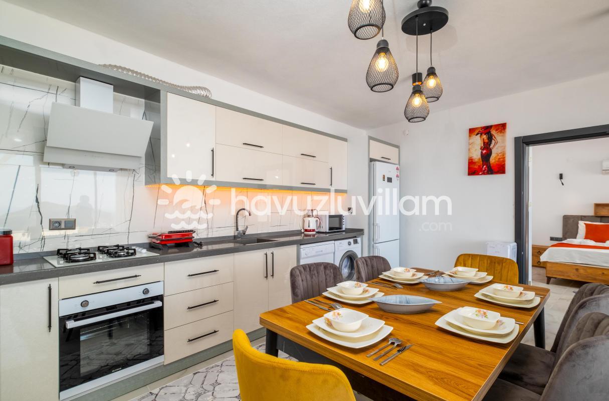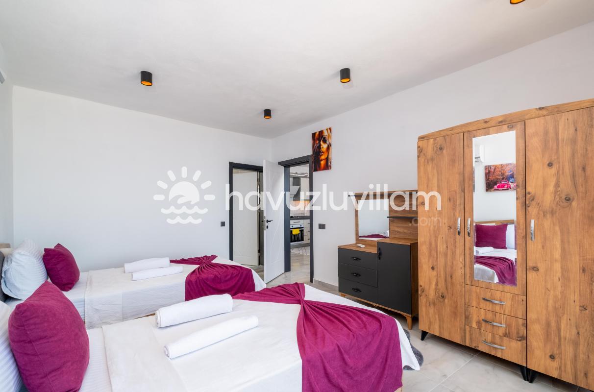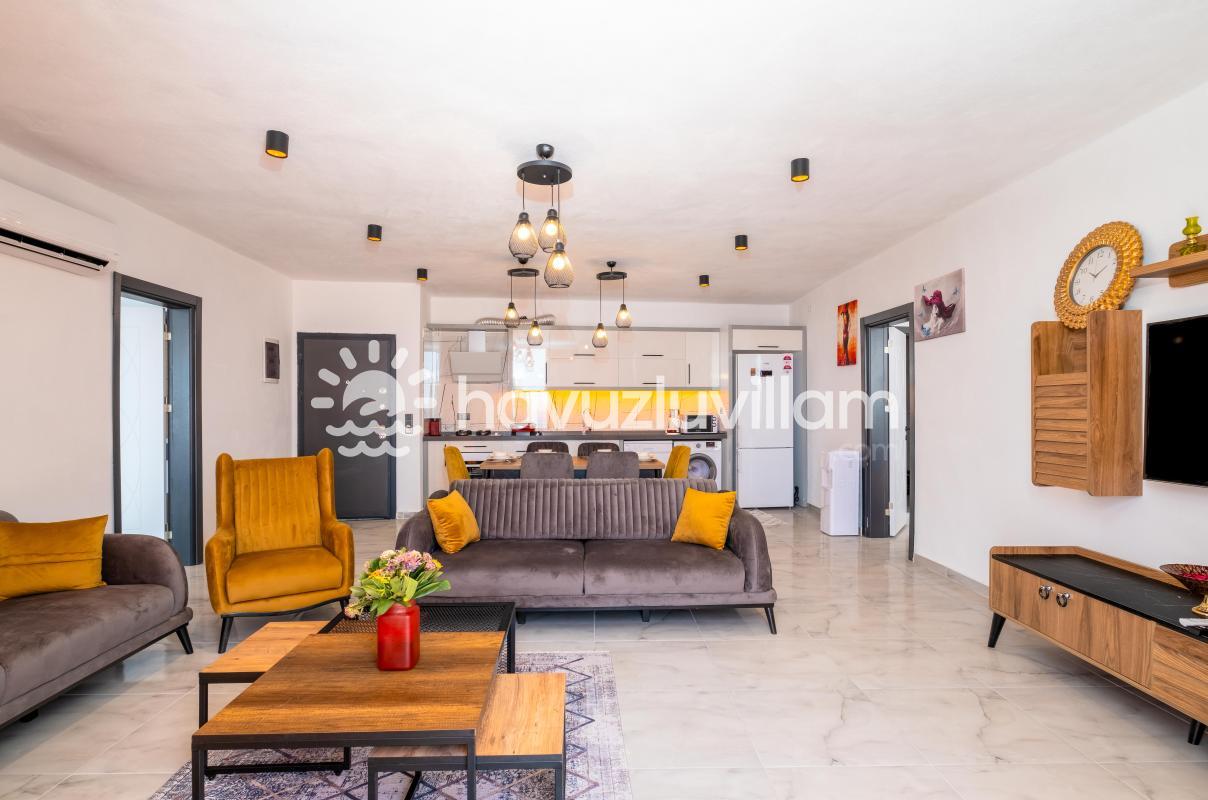 Villanın iç tasarımı modern ve şık detaylarla donatılmıştır. Konforlu yatak odaları, rahat bir uyku deneyimi sunarken, geniş ve ferah oturma odası tüm misafirlerin rahatlıkla dinlenip vakit geçirebilmesi için tasarlanmıştır. Sabahları kuş cıvıltılarına uyanıp, havuz başında kahvaltı yaparak gününüze başlamak için daha ne isteyebilirsiniz?